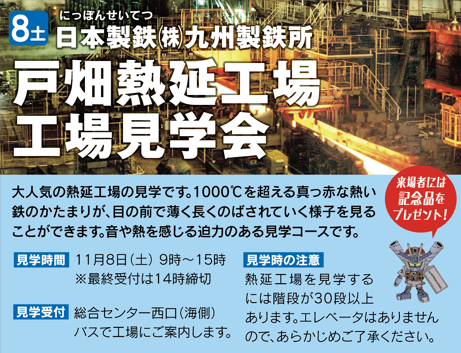 大人気の熱延工場の見学です。1000°Cを超える真っ赤な熱い鉄のかたまりが、目の前で薄く長くのばされていく様子を見ることができます。音や熱を感じる迫力のある見学コースです。来場者には記念品をプレゼントします!